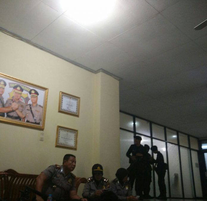 Kapolresta Pontianak Kombes Iwan Susilo yang sudah standbye di pintu masuk Mapolda langsung melakukan koordinasi dengan peserta aksi.
